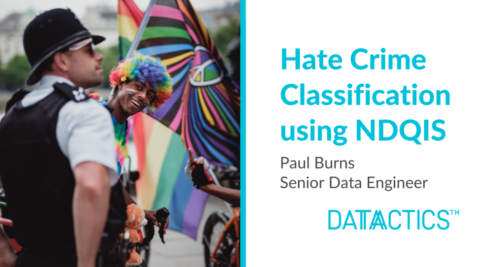NDQIS automates the process of classifying crimes through codifying human decision-making into rule sets based on Home Office classifications. As well as reducing their exposure to potentially distressing data, NDQIS offers data stewards quantifiable benefits in time saved reviewing crime records. Whilst human intervention is still required to review certain classifications, the automation means that detecting and fixing data quality checks is a much faster operation.